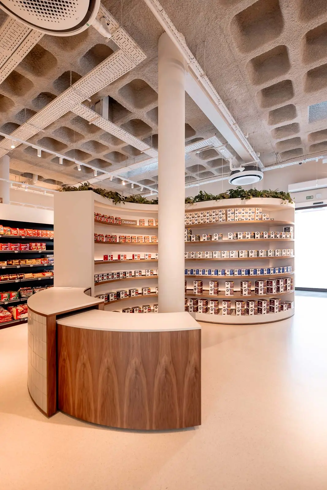 Inside, the store offers an immersive sensory experience. Natural light is optimized through skylights and glazed surfaces, while materials such as wood, ceramics, and terrazzo with recycled glass contribute to a sustainable and welcoming aesthetic.